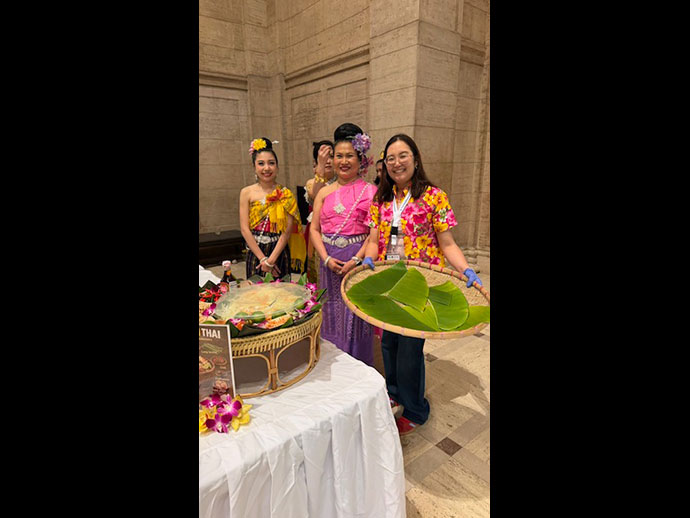 โต๊ะนิทรรศการของชำร่วย สินค้าไทย ซึ่งมีผู้สนใจเข้าชมตลอดทั้งวัน บ้างก็เข้ามาขอคำอธิบายถึงวันปีใหม่ไทย และเข้าร่วมเรียนการร้อยมาลัยด้วย ส่วนในห้องออดิทอเรี่ยมชั้นบน ช่วงบ่ายมีการแสดงนาฏศิลป์และดนตรีไทย อาทิ ฟ้อนอวยพร ระบำสงกรานต์บ้านเรา การแสดงดนตรีเพลงไทยเดิมและโปงลาง มีผู้เข้าชมเต็มห้อง ได้รับคำชื่นชมมากมาย นับเป็นสิ่งที่น่าภูมิใจมาก นอกเหนือจากการแสดงยังได้ชิมส้มตำ และข้าวเหนียวมะม่วง (ฟรี) อีกด้วย
