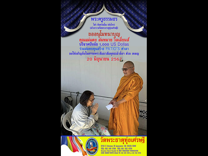 สำหรับสัปดาห์นี้ ขออนุโมทนาบุญคุณแม่แดง สมหมาย วิลเลี่ยมส์ ผู้ร่วมสนับสนุนบำรุ่งวัด ร่วมถวายวิหารทาน บริจาคปัจจัยร่วมสร้าง PATIO ศาลา สมทบทุนมา $1,000 US Dollars และขออนุโมทนาเจ้าภาพปวารณา คณะศรัทธา จาก ร้าน The Thai Restaurant Lancaster California เจ้าภาพปวารณาทุกวันพฤหัสบดี และทุกวันพิเศษ