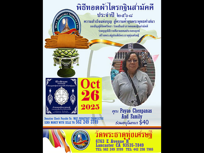 จึงขอเชิญผู้มีศรัทธาช่วยสนุบสนุน วัดพระธาตุทุ่งเศรษฐี ด้วยเทอญ กรุณา Donation check payable to "Buddhist Meditation Society" หรือ อีกบัญชีหนึ่งชื่อ Wat Phrathat Thongsethi ส่งไปตามที่อยู่ที่แจ้งไว้นี้ 6763 East Avenue H. Lancaster CA 93535 ส่วนท่านที่สะดวก Transfer money with Zelle ก็โอนด้วยเบอร์ (562) 249 - 3789 ขออนุโมทนาบุญ มา ณ โอกาสนี้ด้วย รูปขอจำเริญพร