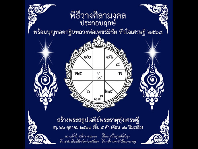 “ขอเชิญร่วมพิธีวางศิลาฤกษ์ เจดีย์แห่งศรัทธา เพื่อเป็นหลักใจและมรดกธรรมแด่ชนรุ่นหลัง บุญใหญ่ครั้งหนึ่งในชีวิต ร่วมกันสืบพระศาสนาให้มั่นคงถาวร”