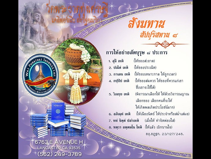 บริจาคช่วยค่าน้ำ ค่าไฟฟ้าโดยตรง กรุณา Donation check payable to "Buddhist Meditation Society" หรือ อีกบัญชีหนึ่งชื่อ Wat Phrathat Thongsethi ส่งไปตามที่อยู่ที่แจ้งไว้นี้ 6763 East Avenue H. Lancaster CA 93535 ส่วนท่านที่สะดวก Transfer money with Zelle ก็โอนด้วยเบอร์ (562) 249 - 3789 ขออนุโมทนาบุญ มา ณ โอกาสนี้ด้วย รูปขอจำเริญพร