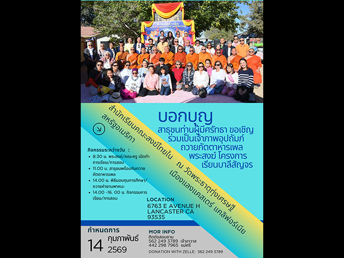 ขอเชิญร่วมสนับสนุนบริจาคปัจจัยสมทบทุนทอดผ้าป่าสามัคคี เพื่อสนับสนุนทุนการศึกษา / ค่ายานพาหนะ โครงการเรียนบาลีสัญจร ของสำนักเรียนบาลีคณะสงฆ์ไทยในสหรัฐอเมริกา ตลอดถึงถวายบำรุ่งส่งเสริมเติมค่าน้ำ ค่าแก๊ส ค่าไฟฟ้า และเพื่อพัฒนาเสนาสนะที่อยู่อาศัยของวัดพระธาตุทุ่งเศรษฐี ได้โดย Donation check payable to "Buddhist Meditation Society" หรือ Wat Phrathat Thongsethi ส่งไปตามที่อยู่ที่แจ้งไว้นี้ 6763 East Avenue H. Lancaster CA 93535 ส่วนท่านที่สะดวก Transfer money with Zelle ก็โอนด้วยเบอร์ (562) 249 - 3789 ขออนุโมทนาบุญ มา ณ โอกาสนี้ด้วย รูปขอจำเริญพร