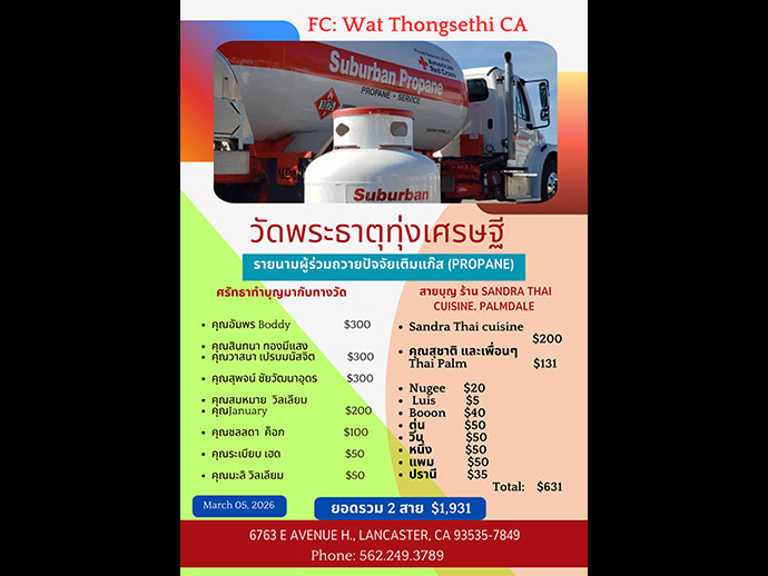 “วันนี้หรือแม้จะวันไหนๆ วันธรรมดาอาจดูเรียบง่าย แต่หากเติมความรัก ความเมตตา ความมีน้ำใจ การแบ่งปันสิ่งที่ดีต่อกันเข้าไป มันจะกลายเป็นวันที่พิเศษเสมอ” การสนับสนุนของท่านสร้างลมหายใจที่อ่อนโยนให้วัดพระธาตุทุ่งเศรษฐี สง่างามและมั่นคง ร่วมถวายปัจจัยเติมแก๊ส สร้างแสงสว่างไฟฟ้า และเพื่อพัฒนาเสนาสนะที่อยู่อาศัยของวัดได้โดย Donation check payable to "Buddhist Meditation Society" หรือ Wat Phrathat Thongsethi ส่งไปตามที่อยู่ที่แจ้งไว้นี้ 6763 East Avenue H. Lancaster CA 93535-7849 ส่วนท่านที่สะดวก Transfer money with Zelle ก็โอนด้วยเบอร์ (562) 249 - 3789 ขออนุโมทนาบุญ มา ณ โอกาสนี้ด้วย รูปขอจำเริญพร
