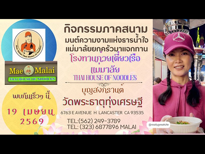 ขอจำเริญพร ธรรมะสบายๆ สไตล์วัดพระธาตุทุ่งเศรษฐี ขอเชิญพุทธศาสนิกชนร่วมงานบุญมหาสงกรานต์ ณ วัดพระธาตุทุ่งเศรษฐี เมืองแลงแคสเตอร์ แคลิฟอร์เนีย สหรัฐอเมริกา เนื่องในวาระอันเป็นมงคลแห่ง เทศกาลปีใหม่ไทย (สงกรานต์) ขอเชิญญาติโยมทุกท่าน ร่วมสืบสานวัฒนธรรมอันดีงาม พร้อมสร้างบุญกุศล เสริมสิริมงคลแก่ชีวิตและครอบครัว กำหนดการจัดงาน 19 เมษายน ศกนี้