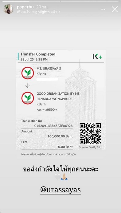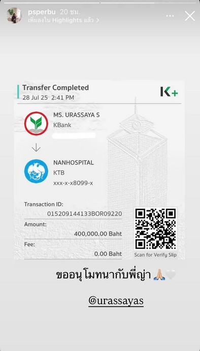 ล่าสุด ญาญ่า อุรัสยา เสปอร์บันด์ ได้บริจาคเงินช่วยเหลือโรงพยาบาลน่าน เป็นเงิน 4 แสน รวมทั้งบริจาคอีก 1 แสนผ่านมูลนิธิองค์กรทำดี ซึ่งคุณแม่ปลาได้โพสต์ภาพสลิปโอนเงินและมีข้อความเขียนเอาไว้ว่า “ขอส่งกำลังใจให้ทุกคนนะคะ” และ “ขออนุโมทนากับพี่ญ่า”