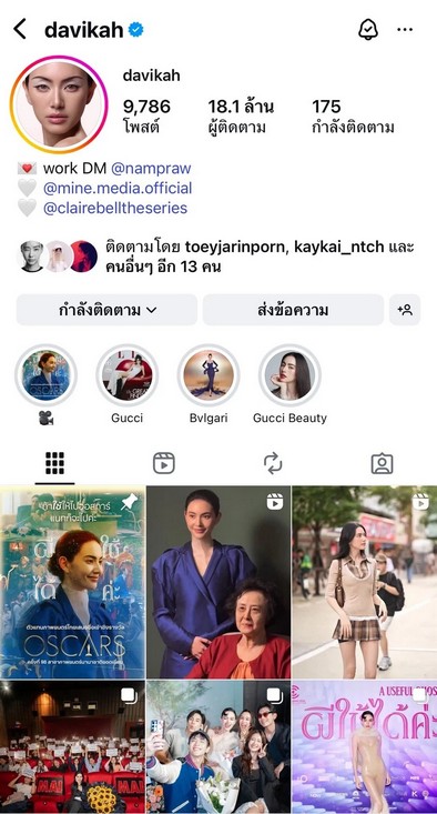 ไม่แพ้กันสำหรับนางเอกสาว “ใหม่ ดาวิกา โฮร์เน่“ ที่บัญชี @davikah มียอดผู้ติดตามสูงถึง 18.1 ล้านคน ด้วยสไตล์แฟชั่นที่โดดเด่นและชีวิตส่วนตัวที่น่าติดตาม ทำให้เธอกลายเป็นหนึ่งในผู้ทรงอิทธิพลสูงสุดบนแพลตฟอร์มนี้...
