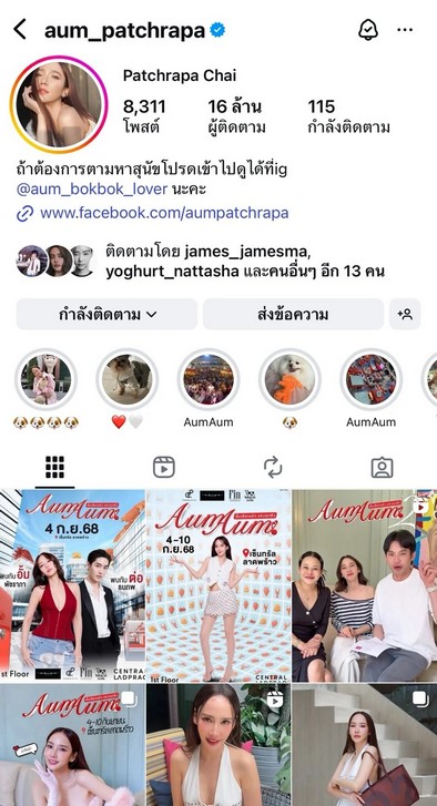 ปิดท้ายด้วยซุป’ตาร์ตัวแม่ของวงการบันเทิงไทย “อั้ม พัชราภา ไชยเชื้อ” ที่บัญชี @aum_patchrapa มียอดผู้ติดตามกว่า 16 ล้านคน ยืนยันสถานะความเป็นเบอร์หนึ่งที่ยังคงครองใจแฟนๆ มาอย่างยาวนาน แม้จะอยู่ในวงการมานาน แต่ความนิยมของเธอก็ไม่เคยลดลงเลย...