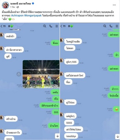 โดย จ๊ะ ได้แชร์ความหวานนี้ผ่านเฟซบุ๊กส่วนตัวซึ่งได้โพสต์ภาพแชทไลน์ที่คุยกับแฟนหนุ่ม พร้อมแคปชั่นซึ้ง ๆ ว่า “ตั้งแต่มีเอ็งเข้ามา ชีวิตข้าก็มีความสุขมากกกกกก ทั้งเอ็ง และครอบครัว ป๊า ม๊า ดีกับข้าแบบสุดๆ ขอบคุณเอ็งมากๆ นะ Achirapon Wongariyapak ไม่ต้องซื้อหรอกคับ ที่สร้างบ้าน ข้าไม่อยากได้อะไรเลยยยย นอกจาก “เอ็ง”“...