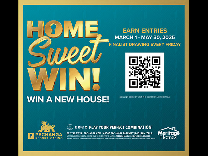 Beginning Saturday, March 1 and ending at 9:30 p.m. on May 30, Pechanga Club members can earn entries into the Home Sweet Win promotion by playing their favorite slot machines or table games with a Club card. Pechanga Resort Casino introduces more fun ways to earn drawing entries on multiple days through the week and special kiosk events starting in April. Visit the Home Sweet Win webpage at Pechanga.com/homegiveaway for details.