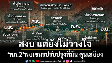เมื่อเวลา 09.30 น.วันที่ 1 ม.ค.2569 กองทัพภาคที่ 2 (ทภ.2) สรุปสถานการณ์ชายแดนไทย-กัมพูชา วานนี้ (31 ธ.ค.68) ภาพรวมตลอดแนวชายแดนยังคง “สงบ แต่ยังไม่สามารถวางใจ” พื้นที่หลักหลายจังหวัดไม่พบความเคลื่อนไหวผิดปกติ ขณะที่ฝ่ายกัมพูชายังคงเดินหน้าเสริมความแข็งแรงที่มั่นอย่างต่อเนื่อง ท่ามกลางการเฝ้าระวังอย่างใกล้ชิดของฝ่ายไทย