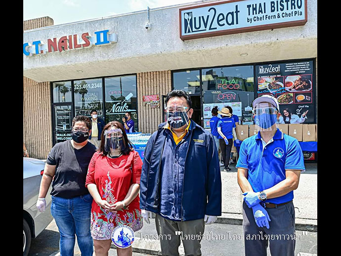 ท่านกงสุลใหญ่มังกร ประทุมแก้ว และ คุณตัน พัฒนะ นายกสภาไทยทาวน์ฯ นำทีมงานบริหารฯ ไปช่วยแจก- อาหารสด ที่ที่ ร้าน Luv 2 eat แจกฟรี! จำนวน 300 ชุด –ข้าวกล่องแบบ 3 หลุม มีข้าวสวย+น้ำพริกกะปิ+ผักลวก+หมูฮ้องภูเก็ต+ไข่ต้ม, ข้าวกะเพราไก่สับใส่มะเขือม่วง, ข้าวกะเพรามะเขือม่วงผักรวม, ขนมทับทิมกรอบ, เกี๊ยวกุ้ง CP 100ถ้วย, หน้ากากอนามัย-หน้ากากผ้า จากสภาไทยทาวน์ฯ * แจกตั้งแต่เวลา 13.00น.เป็นต้นไป (แจกจนของหมด)