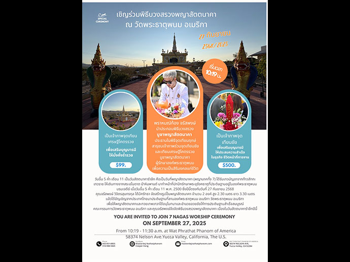 ขอเชิญทุกท่านร่วมงานพิธีบวงสรวงสมโภชองค์พญานาคคู่ ปกปักรักษาองค์พระธาตุพนมจำลอง ณ วัดพระธาตุพนมยูเอสเอ ในวันเสาร์ที่ 27 กันยายน เวลา 10.19น. สำหรับผู้ที่เกิดในปีมะโรง และมะเส็ง หรือลูกหลานและผู้ที่ศรัทธาในองค์พญานาค ถือเป็นบุญใหญ่ที่ไม่ใช่เรื่องที่จะสำเร็จหรือเกิดขึ้นบ่อยครั้งในประเทศสหรัฐอเมริกา