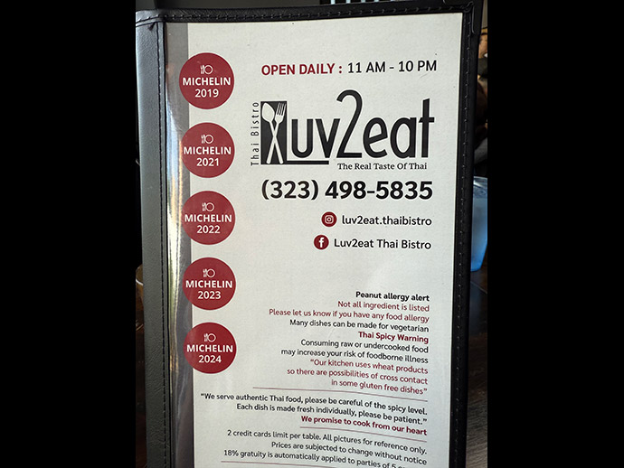 ร้าน Luv2eat Thai Bistro อยู่เลขที่ 6660 Sunset Blvd, Los Angeles, CA 90028 เปิดบริการทุกวัน จันทร์-อาทิตย์ ตั้งแต่ 11:00 am - 10:00 pm Tel 323-498-5835