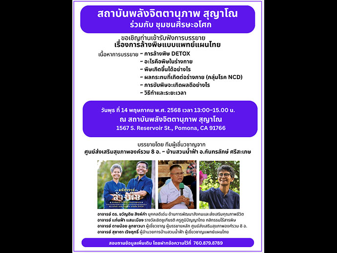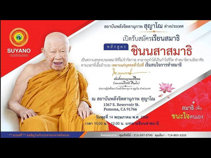 ณ สถาบันพลังจิตตานุภาพ สุญาโณ 1567 S. Reservoir Street, Pomona, CA 91766 ติดต่อสอบถามข้อมูล ที่ 714-987-8090 หรือ 213-247-5790