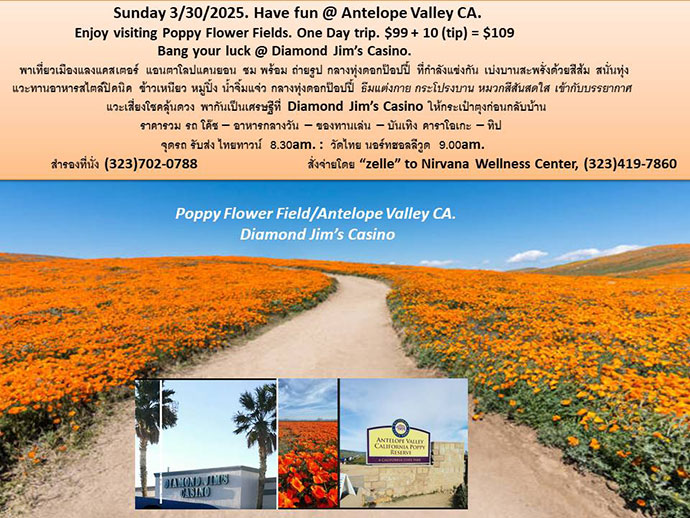 จั่วหัวเรื่องไว้อย่างนี้ เพราะมาดามจะชวนแฟนคลับไปเที่ยวชมดอกไม้ช่วงฤดูใบไม้ผลิ เริ่ม 20 มีนาคม – 20 มิถุนายน ซึ่งเป็นช่วงที่ดอกไม้จะเบ่งบาน แข่งกันสวยงามมากที่สุด ช่าง เป็นความโชคดีของชุมชนในรัฐแคลิฟอร์เนีย เพราะใกล้ๆเมืองลอสแอนเจลิส มีให้ทุ่งดอกไม้ให้ชมมากมาย ไม่ว่าจะเป็นเป็นทุ่งดอกไม้ทั้งของบริษัทส่วนตัว หรือทางภาครัฐแล้วแต่ความสะดวก มาดามได้พาแฟนคลับไปชมทุ่งดอกไม้ Carlsbad มา 2 ครั้ง การตอยรับดีมาก มาคราวนี้วางแผนจะชวนแฟนคลับไปชมทุ่งดอกป๊อปปี้เป็นดอกไม้ประจำรัฐแคลิฟอร์เนียที่แลงแคสเตอร์ซึ่งอยู่ห่างจากแอลเอเพียง ชั่วโมงครึ่ง ในวันอาทิตย์ที่ 30 มีนาคม 2025 นี้ รีบสำรองที่นั่งกับมาดาม ที่ (323)702-0788