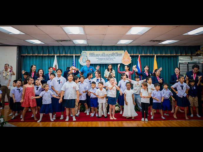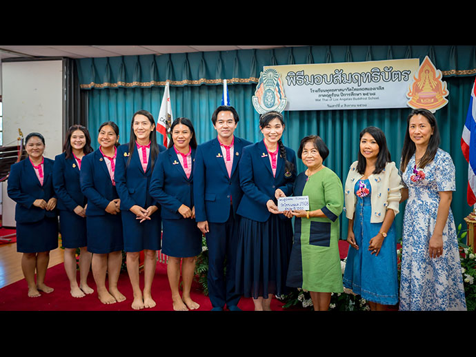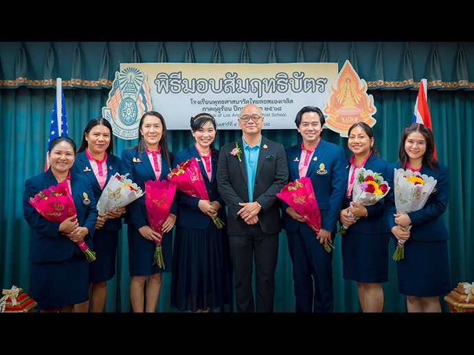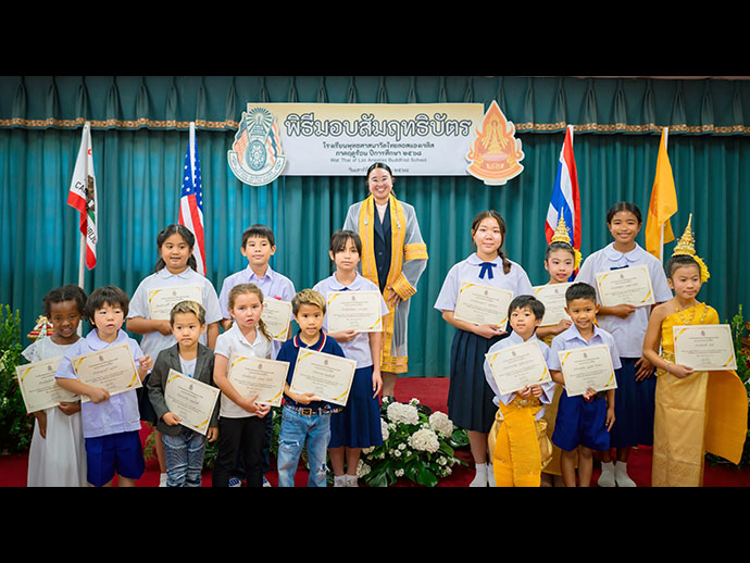 กิจกรรมอันเนื่องด้วยวัฒนธรรมไทยอีกส่วนหนึ่งซึ่งวัดไทยฯ จัดขึ้นเพื่อคืนกำไรให้พี่น้องไทยอย่างต่อเนื่อง คือ การเรียนการสอนภาษาไทยและวัฒนธรรมไทย ภาคฤดูร้อน โรงเรียนพุทธศาสนาวัดไทยฯ โดยได้รับความร่วมมืออย่างดียิ่งจากศูนย์ส่งเสริมการสอนภาษาไทยและวัฒนธรรมไทยในต่างประเทศ คณะครุศาสตร์ จุฬาฯ จัดส่งคณะครูอาสาสมัครมาดำเนิน การสอนเป็นรุ่นที่ 41 มีครูจุ๊บ อ.พรพิมล ศิริวัฒน์ จากสาธิตจุฬาฯ ฝ่ายประถม เป็นหัวหน้า โดยเริ่มดำเนินการสอนมาตั้งแต่วันจันทร์ที่ 9 มิถุนายน 2568 เป็นต้นมา ผู้ปกครองส่งบุตรหลานสมัครเรียนจำนวน 67 คน ซึ่งการเรียนการสอนได้สิ้นสุดลงแล้วเมื่อสัปดาห์ที่ผ่านมา คณะครูอาสาฯ ได้ร่วมใจกันจัดพิธีปิดภาคเรียนและมอบสัมฤทธิบัตร เมื่อบ่ายวันเสาร์ที่ 9 สิงหาคม ที่ผ่านมา ท่านกงสุลใหญ่ ณ นครลอสแอนเจลิส คุณต่อ ศรลัมพ์ ให้เกียรติเป็นประธานในพิธี ผู้ปกครองพร้อมใจกัน “อุ้มลูกจูงหลาน” เข้าร่วมพิธีอย่างตื่นเต้นยินดีและอบอุ่น หลังพิธีมอบเป็นการแสดงนาฏศิลป์และดนตรีไทยของเด็กๆ ที่ได้รับการฝึกฝนจากคุณครูมาเป็นเวลา 9 สัปดาห์ ซึ่งเด็กๆ แสดงได้อย่างน่ารักสวยงามไพเราะ ผู้ปกครองประทับใจกันมาก