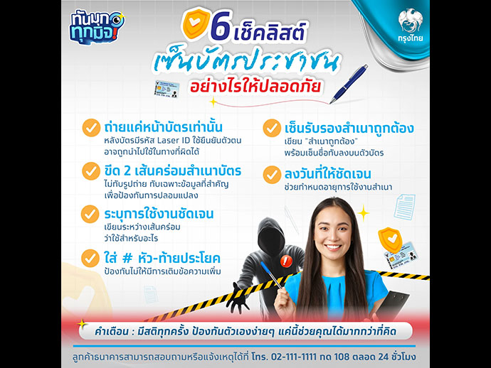 รู้ไว้ไม่เสียหาย! 6 วิธีเซ็นบัตรประชาชนแบบไหน ให้ปลอดภัยจาก "มิจฉาชีพ" “ธนาคารกรุงไทย” ได้ออกมาโพสต์เพจเฟซบุ๊กแนะนำวิธีการเซ็นบัตรประชาชนอย่างไรให้ปลอดภัยจากมิจฉาชีพ โดยระบุว่า ทันมุกทุกมิจ 6 Checklist เซ็นบัตรประชาชนอย่างไรให้ปลอดภัย เชื่อว่าหลายคนคงเคยได้ยินข่าว การถูกแอบอ้างเอกสารสำคัญไปทำธุรกรรมต่าง ๆ จนสร้างความเสียหาย โดยเฉพาะสำเนาบัตรประชาชนที่เราต้องใช้บ่อยที่สุด ล่าสุด สคบ. ได้แนะนำวิธีการเซ็นรับรองสำเนาแบบปลอดภัย ที่จะช่วยให้เรายื่นสำเนาบัตรประชาชนได้อย่างมั่นใจ ไม่ต้องกังวลว่าจะถูกนำไปใช้ในทางที่ผิดอีกต่อไป