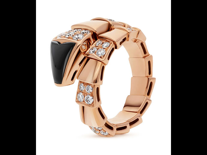 แหวนโรสโกลด์ 18 กะรัต คอลเลกชัน Serpenti Viper one-coil ประดับเพชรและโอนิกซ์สีดำบนหัวแหวน