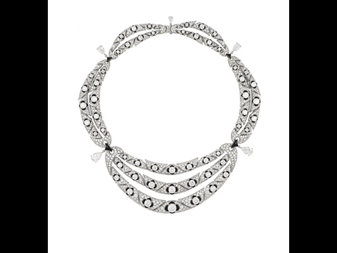 สร้อยคอแพลตตินัมเครื่องประดับชั้นสูงประดับด้วยโอนิกซ์ เพชรทรงกลม 6 เม็ด เพชรทรงลูกแพร์ 1 เม็ด เพชรทรงกลม 11 เม็ด และเพชรพาเว่