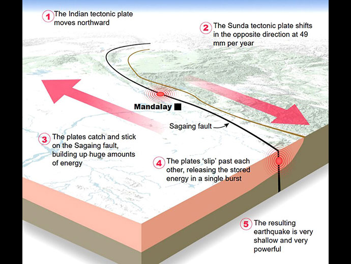 นักวิชาการด้านธรณีวิทยาและแผ่นดินไหวรู้ดีว่าเมียนมามีแนวของรอยเลื่อนแผ่นดินไหวผ่ากลางประเทศอยู่ เรียกว่ารอยเลื่อนสะกาย เป็นรอยเลื่อนมีพลัง เคลื่อนไหวอยู่โดยตลอด และขึ้นชื่อว่าเป็นรอยเลื่อนแผ่นดินไหวที่ร้ายกาจรุนแรงเป็นอันดับต้นๆ ของโลก รอยเลื่อนสะกายนี่เองที่เป็นที่มาของเหตุวิบัติภัยทั้งในเมียนมาและไทยในครั้งนี้