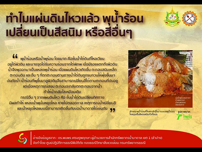 ล่าสุด กรมทรัพยากรธรณี ได้อ้างอิงข้อมูลจาก ดร.พบพร เศรษฐพฤกษา ผู้อำนวยการสำนักทรัพยากรน้ำบาดาล เขต 1 (ลำปาง) ถึงสาเหตุว่า ทำไมแผ่นดินไหวแล้ว น้ำพุร้อน เปลี่ยนเป็นสีสนิม หรือสีอื่นๆ
