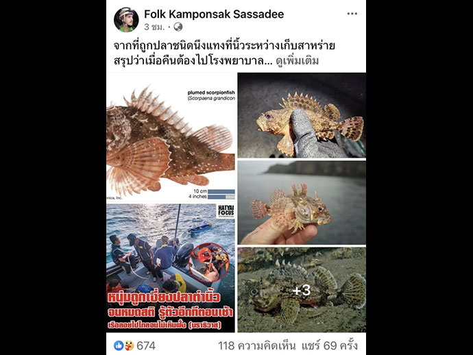 หนุ่มรีวิวประสบการณ์ถูกเงี่ยงปลามีพิษร้ายแรงแทงนิ้ว มีอากาคปวด ลามท้่วแขน ปวดเข้าต้นคอ เข้ารักแร้ หนาวสั่น หายใจติดขัด ทรงตัวไม่ได้เดินเซ เผยชนิดปลาคือปลาอีปุ๊มีพิษรุนแรงมากที่สุดชนิดหนึ่ง
