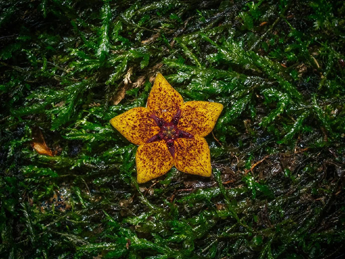 กลางดอกโดดเด่นด้วยกระบังรอบสีแดงเข้ม 5 แฉก รูปทรงคล้ายดาวทะเลที่นิ่งสงบใต้ผืนทะเลลึก