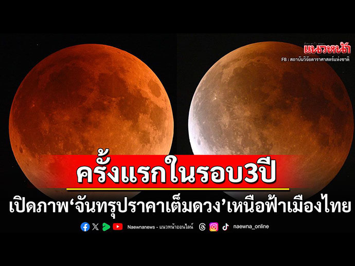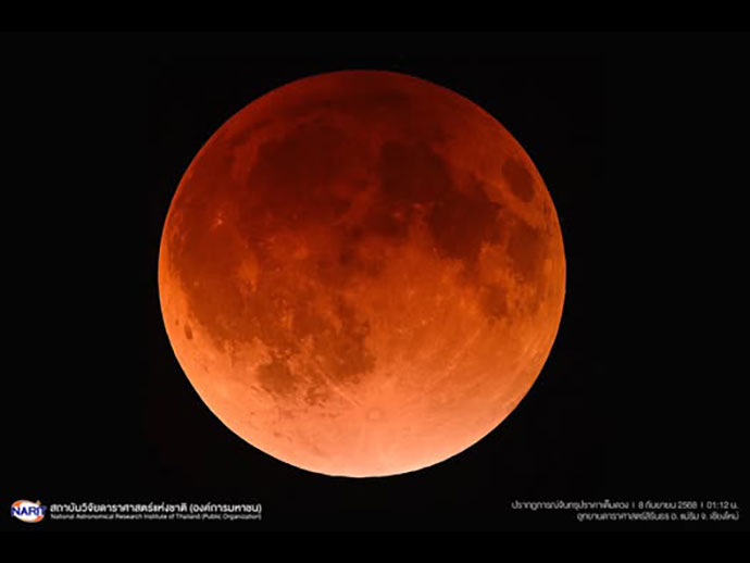วันจันทร์ ที่ 8 กันยายน พ.ศ. 2568:สถาบันวิจัยดาราศาสตร์แห่งชาติ (NARIT) ได้ออกมาเปิดเผยภาพ ปรากฏการณ์จันทรุปราคาเต็มดวงเหนือฟ้าเมืองไทย ขณะเกิดคราสเต็มดวง ดวงจันทร์เต็มดวงปรากฏสีแดงอิฐ บันทึกภาพ ณ อุทยานดาราศาสตร์สิรินธร อ. แม่ริม จ. เชียงใหม่ ช่วงกึ่งกลางคราส เวลาประมาณ 01.12 น. วันนี้ ซึ่งมีผู้สนใจติดตามชมถ่ายทอดสดปรากฏการณ์ผ่านทางเฟซบุ๊กและยูทูบของ NARIT
