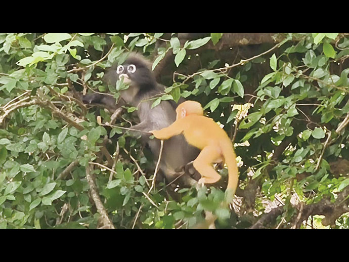 แต่ที่เป็นไฮไลต์ดาวเด่นในกิจกรรมนี้และเป็นจุดที่นักท่องเที่ยวสนใจเป็นพิเศษคือ “ค่างแว่นถิ่นใต้” ที่อาศัยอยู่บริเวณเขาล้อมหมวก โดยเฉพาะลูกค่างแว่นตัวสีทอง หรือสีออกส้ม ออกมาเล่นซุกซนอวดโฉมความน่ารักให้นักท่องเที่ยวเห็น โดยมีพ่อแม่คอยนั่งประกบอยู่อย่างใกล้ชิด