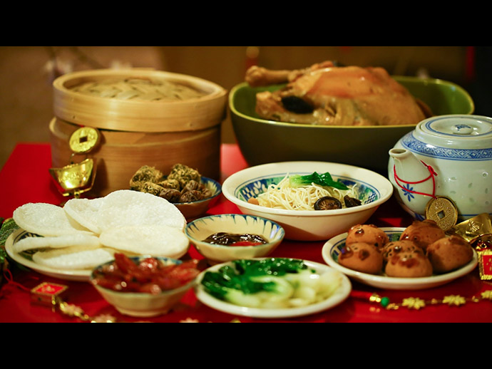 ทานของชื่อมงคล ได้แก่ส้ม (โชคลาภ), ปลา (เหลือกินเหลือใช้), บะหมี่ (อายุยืน การทำงานยาวไป) กินให้ฉ่ำ รับรองปัง