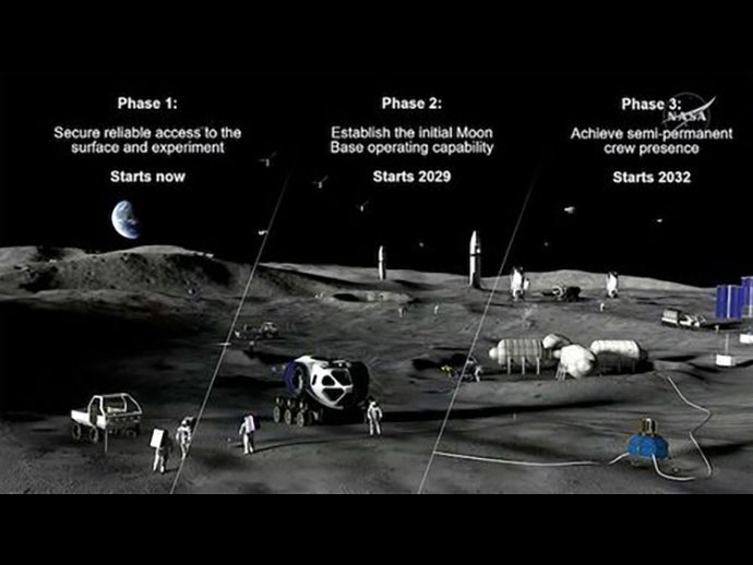 NASA ยังได้ประกาศแนวทาง 3 ระยะในการสร้างฐานบนดวงจันทร์ โดยจะมีการระงับโครงการสร้างสถานีอวกาศ Lunar Gateway รอบดวงจันทร์ ในรูปแบบปัจจุบันไว้ก่อน เพื่อนำทรัพยากรไปทุ่มเทให้กับโครงสร้างพื้นฐานบนพื้นผิวดวงจันทร์โดยตรง แม้จะมีอุปสรรคด้านอุปกรณ์บางอย่าง แต่หน่วยงานจะปรับเปลี่ยนการใช้อุปกรณ์ที่มีอยู่และใช้ประโยชน์จากข้อตกลงกับพันธมิตรนานาชาติเพื่อสนับสนุนเป้าหมายนี้