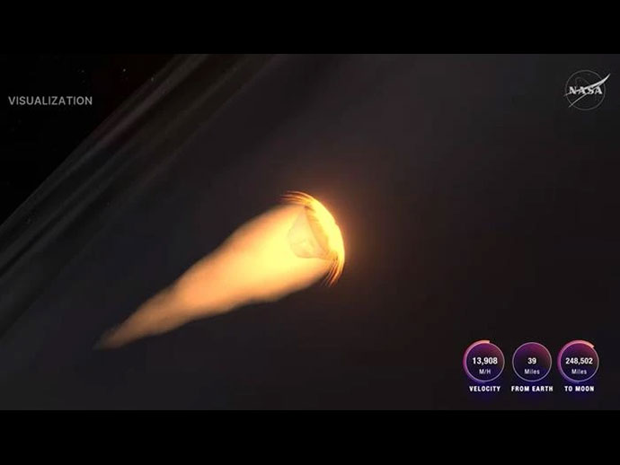 การเดินทางกลับสู่พื้นผิวโลกของภารกิจ Artemis 2 ยาน Orion ได้แยกส่วนก่อนเดินทางเข้าสู่ชั้นบรรยากาศโลก โดยยานแคปซูลได้แยกตัวออกจากยานบริการ (Service Module) ซึ่งทำหน้าที่ขับเคลื่อนเพื่อเดินทางไปและกลับจากดวงจันทร์ เหลือเพียงแคปซูลที่บรรทุกนักบินทั้ง 4 โคจรเข้าสู่ชั้นบรรยากาศโลกที่ความสูงประมาณ 120 กิโลเมตร และเคลื่อนที่ลงสู่พื้นผิวโลกด้วยความเร็วประมาณ 40,000 กิโลเมตรต่อชั่วโมง การเคลื่อนที่ผ่านชั้นบรรยากาศทำให้เกิดการเสียดสีทำให้เกิดความร้อนสูงที่มีอุณหภูมิสูงประมาณ 2,700 องศาเซลเซียสรอบยาน โดยจะเห็นยานถูกห่อหุ้มเปลวไฟลุกโชน เมื่อผ่านช่วงเสียดสีกับชั้นบรรยากาศยานได้กางร่มชูชีพออกเพื่อชะลอความเร็วตามลำดับความสูง และได้ลงจอดสู่มหาสมุทรแปซิฟิกบริเวณนอกชายฝั่งรัฐแคลิฟอร์เนีย สหรัฐอเมริกา โดยมีทีมกู้ภัยของสหรัฐฯ รอรับ นำตัวนักบินและยานแคปซูลกลับขึ้นฝั่งอย่างปลอดภัย