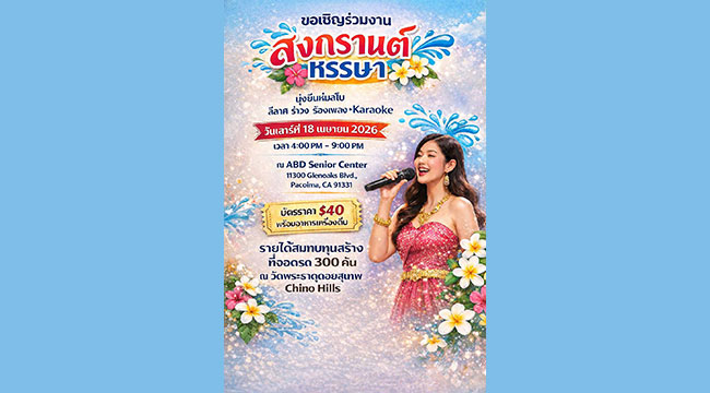 ลอสแอนเจลิส—มหานครที่เต็มไปด้วยสีสันของวัฒนธรรมจากทั่วโลก กำลังจะกลับมามีชีวิตชีวาอีกครั้งกับ “งานสงกรานต์ ปีใหม่ไทย ประจำปี 2569” ในวันที่ 26 เมษายน 2026 ที่ทุกคนรอคอย