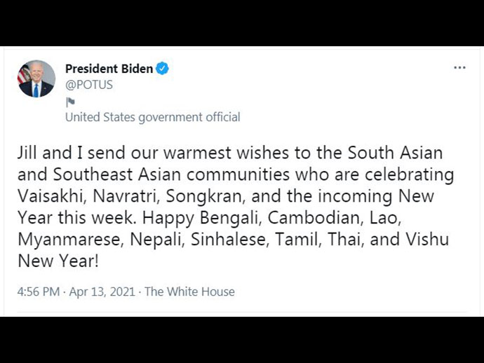 ประธานธิบดีสหรัฐอเมริกา โจ ไบเดน (Joe Biden) และสตรีหมายเลข 1 Jill Biden ส่งสารถึงคนไทยและชุมชนเอเชีย เนื่องในวันปีใหม่ไทย สงกรานต์ และปีใหม่ของชาวเอเชียหลายชาติ