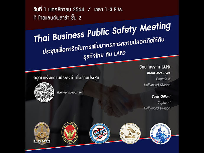 สืบเนื่องมาจาก ธุรกิจไทยในเขต West Hollywood, Thai Town, Hollywood และธุรกิจที่อยู่ในความดูแลของ LAPD มีคดีโดนโจรกรรมสูงขึ้น ไม่ว่าจะเป็นทุบกระจกร้านค้าเพื่อขโมยของในยามวิกาล หรือบ่อยครั้งที่หลายๆ ธุรกิจโดนขโมยของในเวลากลางวัน ทนายรอสลิน ปัทมคันธิน ประธานสภาหอการค้าไทยฯ ได้นำแจ้งเรื่องนี้กับ Chief Michel Moore ผบ.ตร.ของ LAPD ในการประชุมที่ผ่านมาเมื่อวันที่ 4 ตุลาคม 2564 ท่าน Chief Moore จึงมีคำสั่งให้ Danny Chao, Police Officer III ซึ่งท่านดำรงตำแหน่ง Asian Community Liaison ประสานงานกับสภาหอการค้าไทยฯ เพื่อจัดประชุม “Thai Business Public Safety Meeting”