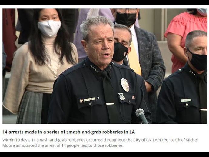 โดย Chief Michel Moore หัวหน้ากรมตํารวจลอสแองเจลิส Mayor Eric Garcetti นายกเทศมนตรีเมืองนครลอสแอนเจลิส Blake Chow ผู้บัญชาการแอลเอพีดีเขตฮอลลีวูด และทีมตำรวจแอลเอพีดีร่วมการแถลงการในครั้งนี้ โดยในรอบเดือนที่ผ่านมาสามารถจับกุมผู้ต้องหา 14 คน จากเหตุการณ์ปล้นสะดม 11 ครั้ง
