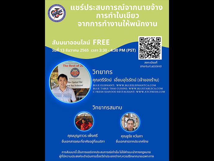ฟรีสัมมนา วันที่ 13 ธันวาคม 2565 เวลา 3:30 - 4:30 PM แชร์ประสบการณ์ การทำเรื่องวีซ่าทำงานให้พนักงาน จากเจ้าของกิจการ ลงทะเบียนที่
