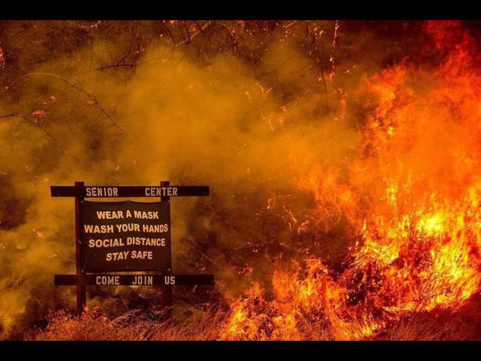 เคราะห์ซ้ำกรรมซัด ซานฟรานซิสโกเบย์แอเรียถูกพระเพลิงโหมกระหน่ำเข้ามาทุกด้าน ทางเหนือจากโซโนมา ซานตาโรซ่า นาปา คาริสโตกา ตะวันออกลูกไฟพวยพุ่งจากแว็กเกอร์วิล แฟร์ฟิวด์ อลามีดา ฟรีมอนท์ มอแกนฮิลว์ ทางตะวันตกซานมาเทล และทางใต้ซานตาครู้ส ทั้งบ้านเรือนร้านค้าและไร่นาวอดวายสร้างความทุกข์ระทมไปทุกหย่อมย่าน ความทุกข์ถาถม หมดทั้งบ้าน ไม่มีทั้งงาน บ้านแตกสาแหลกขาด ขนาดวัดไชยมงคล เมืองแฟร์ฟิวด์ พระเพลิงห่างไปแค่ไมล์เดียว พระคุณเจ้าต้องปีนหลังคาวัดเพื่อฉีดน้ำกันลูกไฟบินมาตก มีพื้นที่เสียหายแล้วกว่าล้านเอเกอร์.................