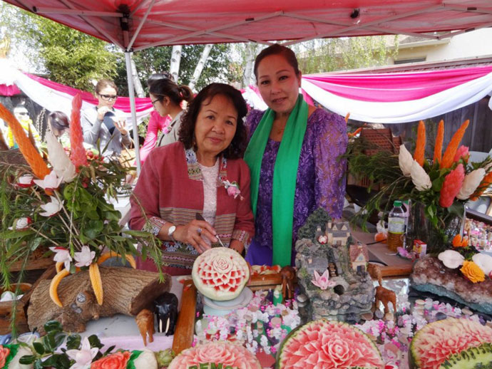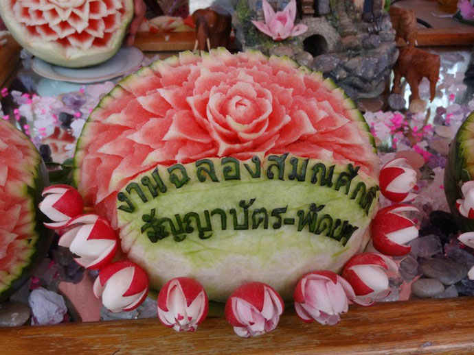 คณะกรรมการมาเชิญชวนพวกเราร่วมรับประทานอาหาร ซึ่งมีซุ้มอาหารอร่อยๆ ไว้บริการกันฟรีๆ ในวันนั้น เราก็ประทับใจอีกกับคำทักทายที่เป็นกันเองและเอาใจใส่แขกที่มาในงานจากผู้ที่อยู่ในซุ้มอาหาร และเราก็ถือโอกาสไปยืนดูคุณครูสอนแกะสลักผักและผลไม้ที่สอนโดย คุณเอ็มมี่ กัญญานัชฐ์ เกษมวัฒนา คุณตวงพร เพชรศรี ก็เลยฝากรูปสวยๆ ของงานสลักผลไม้มาให้ชมกันด้วยค่ะ รวมทั้งการแสดงรำอวยพร กิ่งไม้เงิน กิ่งไม้ทอง โดย ธนฑัต ดิลกวณิชกุล ไอยศรา กิตติวัฒน์-เฮงตระกูล และ ณรันภัค ราชเวชพิศาล