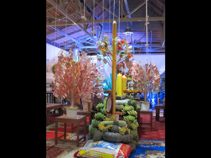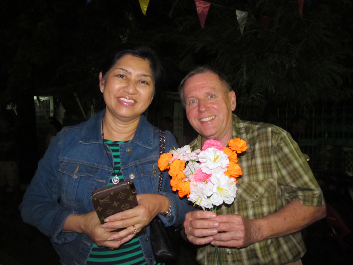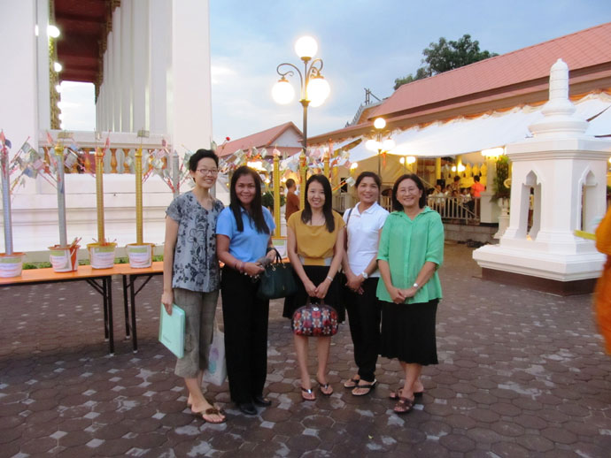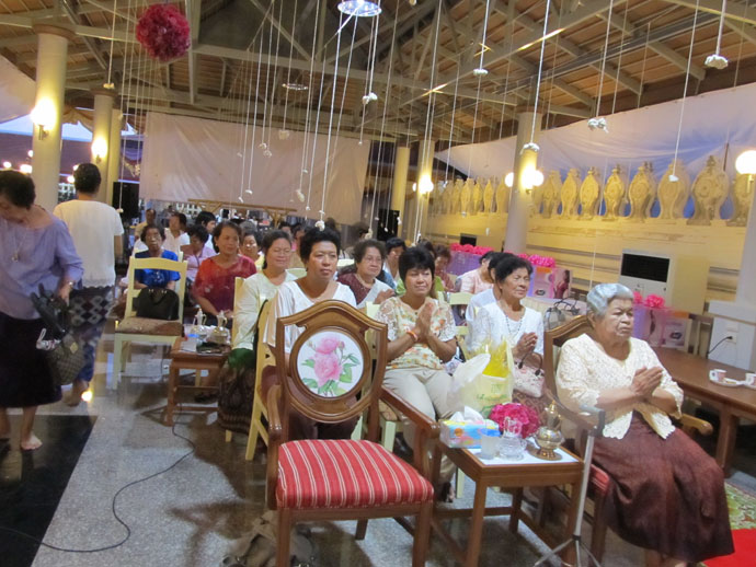 โดยมี พระวิเทศธรรมกวี เป็นประธานสงฆ์ คู่บ่าวสาวจุดธูปเทียนบูชาพระรัตนตรัย สมาทานเบญจศีล และฟังพระเจริญพระพุทธมนต์ จบพิธีทางศาสนา ได้มีพิธีหลั่งน้ำพระพุทธมนต์ (รดน้ำสังข์) ณ เวทีกลางแจ้งหน้าพระอุโบสถ เจ้าสาวและเจ้าบ่าว แต่งกายด้วยชุดผ้าไหมไทย ทั้งคู่เหมาะสมกันดูงามน่ารักแบบไทยๆ ผมเตรียมบทกลอนไปอวยพร แต่ไม่มีโอกาส จึงขออวยพรไว้ ณ โอกาสนี้..
