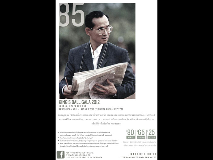 ฉบับนี้ขอกลับมารายงานกิจกรรมสำคัญที่จะมีขึ้นในซานฟรานซิสโกและเบย์แอเรียนะคะ เพื่อที่ให้ท่านผู้อ่านที่จะไปร่วมกิจกรรมได้จดวันเวลาของงานลงในปฏิทินของท่านและไปร่วมงานกันนะคะ นั่นก็คืองานคิงส์กาล่าไนท์เพื่อ เฉลิมพระเกียรติในวโรกาสที่พระบาทสมเด็จพระเจ้าอยู่หัวฯ ทรงเจริญพระชนมพรรษา85 พรรษา ในวันที่ 5 ธันวาคม ศกนี้