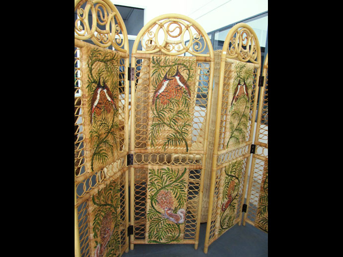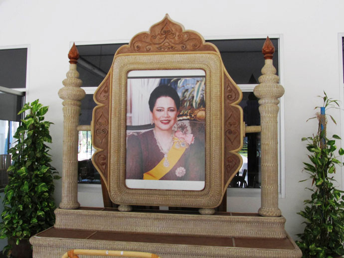 ต่อไปเราก็ไปถึงเรือนฝึกของแผนกช่างจักสานไม้ไผ่ลายขิด ซึ่งสิ่งที่โดดเด่นที่สุดสำหรับพวกเราที่ต่างก็อดไม่ได้ที่จะบันทึกภาพไว้นั่นก็คือ แท่นจักสานหวายที่มีกรอบภาพพระบรมสาทิสลักษณ์ของสมเด็จพระนางเจ้าสิริกิติ์พระบรมราชินีนาถ เป็นภาพที่ทรงพระสิริโฉมงดงามเกินบรรยาย ดูแล้วให้คิดถึงพระองค์เสียจริงๆ ตอนที่เราไปเรือนนี้นั้นไม่ได้พบช่างสักคน อาจจะออกไปรับเบี้ยเลี้ยงอยู่ มีคนบอกว่าวันนี้เป็นวันรับเงินเดือน ซึ่งเจ้าหน้าที่จากทางวังจะมาจ่ายเงินเดือนในวันอังคาร แต่ดิฉันจำไม่ได้ว่าทุกวันอังคารหรือเดือนละครั้ง จึงไม่ขอยืนยันในเรื่องนี้ ช่างที่เรือนทอผ้าคนหนึ่งเล่าว่าการจ่ายเงินนั้นจะดูงานว่าชิ้นที่เราทำนั้นไปถึงไหนแล้ว ดิฉันก็เลยเข้าใจ (เอาเอง) ว่า เป็นการให้ค่าแรงที่ถูกต้องเพราะไม่ใช่ว่าเธอไม่ทำงานเธอจะมานั่งรับเป็นเงินเดือน ทุกคนต้องมีผลงาน ซึ่งทำให้ดิฉันยิ่งประทับใจเพราะเท่ากับเป็นการช่วยคนที่ทำงานจริงๆ