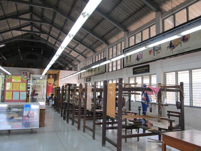 โรงฝึกแรกที่ได้เข้าไปชมกับเพื่อนๆ คือแผนกทอผ้า ในช่วงนั้นเป็นช่วงพักรับประทานอาหารแต่ก็ยังมีช่างนั่งทำงานกันอยู่หลายคน ได้มีโอกาสคุยกับพวกเขา ต่างก็ยินดีสาธิตการทอผ้าให้ได้ชม และในโรงฝึกนั้นดูจะเป็นระเบียบเรียบร้อยต่างทำงานกันด้วยสมาธิที่ดีรวมทั้งครูผู้ฝึกก็มีอัธยาศัยดีต่อนักท่องเที่ยวทุกคน ค่ะ.. นับเป็นความรู้สึกดีๆ ในการมาเยี่ยมชมครั้งนี้มากๆ