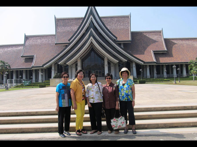 ชมฝีมือช่างสานช่างทอเพียงพอแก่เวลาอันน้อยนิดที่พรรคพวกมีให้ จากนั้นเราก็ตรงไปยังตึกใหญ่ ศาลาพระมิ่งขวัญ เป็นอาคารใหญ่ทรงไทยประยุกต์ สวยงามและหน้าตึกมีทิวทัศน์ที่สวยงามด้วยไม้ประดับที่ดัดเป็นรูปทรงต่างๆ พวกเราถ่ายภาพมุมสวยๆ กันได้หลายมุมก่อนที่จะเข้าไปในตัวอาคาร คราวนี้ต่างคนต่างก็แยกย้ายไปจับจ่ายสิ่งละอันพันละน้อยติดไม้ติดมือไปตามใจชอบ ซึ่งพรรคพวกก็ใช้เวลาช็อปกันพอสมควรแก่เวลา ซึ่งเราได้รับการต้อนรับอย่างดียิ่งจากเจ้าพนักงาน และที่นี่เราสามารถใช้เครดิตคาร์ดได้ทำให้เงินสดในกระเป๋ายังแน่นหนาอยู่พร้อมจะต่อไปยังอยุธยา