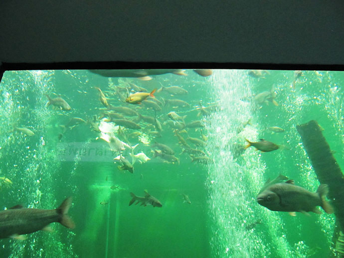 แต่ดิฉันก็ยังถ่วงเวลาขออยู่ต่อ เพราะตั้งใจว่าจะไปดูสิ่งน่าสนใจอีกสองแห่ง นั่นก็คือวังปลา และ สวนนก ซึ่งพรรคพวกก็น่ารักยอมพาไปทั้งสองแห่งที่เหลือแต่มีข้อแม้ว่าขอนั่งรอในรถ โอเค..ไม่ว่ากัน ดังนั้นคนรถจึงขับไปจอดให้ฉันเดินลงไปที่อาคารใหญ่ที่แสดงพันธุ์สัตว์น้ำ หรือที่เรียกว่า วังปลา ดิฉันเดินถือกล้องเข้าไปคนเดียวโดดเดี่ยว วันนั้นไม่มีเจ้าหน้าที่สักคน นอกจากคนทำความสะอาดที่ถูพื้นอยู่ แต่ไหนๆ มาแล้วคนเดียวก็คนเดียว ดิฉันลิ่วละล่องเข้าไปในตัวอาคาร ซึ่งมีตู้กระจกขนาดใหญ่ ผนังโดยรอบบุด้วยกระจกใส ทำทางลาดเอียงจากผิวน้ำสู่ก้นถัง ทำให้ผู้เข้าชมเห็นทศนียภาพจากผิวน้ำถึงก้นถังได้ แสดงพันธุ์ปลาหลากหลายใหญ่มาก เดินชมไปถ่ายภาพไป (โดยไม่ได้ใช้แฟลช) ต้องยอมรับว่าเป็นตู้โชว์ที่ทันสมัยมากๆ ตามผนังโดยรอบอาคารประดับด้วยตู้ปลาขนาดเล็กตลอดแนว มีปลาหาดูยากและมีคำบรรยายอย่างละเอียดอยู่ข้างๆ ชมภาพได้ค่ะ รับรองว่าทันสมัยพอๆ กับ Aquarium หลายๆ แห่งในอเมริกาทีเดียว