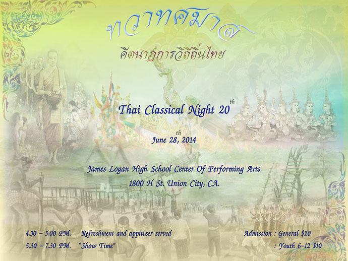 ทวาทศมาส คีตนาฏการวิถีถิ่นไทย Thai Classical Night 20th จะแสดงในวันที่ 28 มิถุนายน 2557 ที่ James Logan High School Center of Performing Arts เลขที่ 1800 H St. Union City, CA. เริ่มเวลา 4.30 – 5.30 p.m. Refreshment and appetizer served 5.30- 7.30 p.m. “Show Time” บัตร ราคา $20 เด็ก 6-12 $10