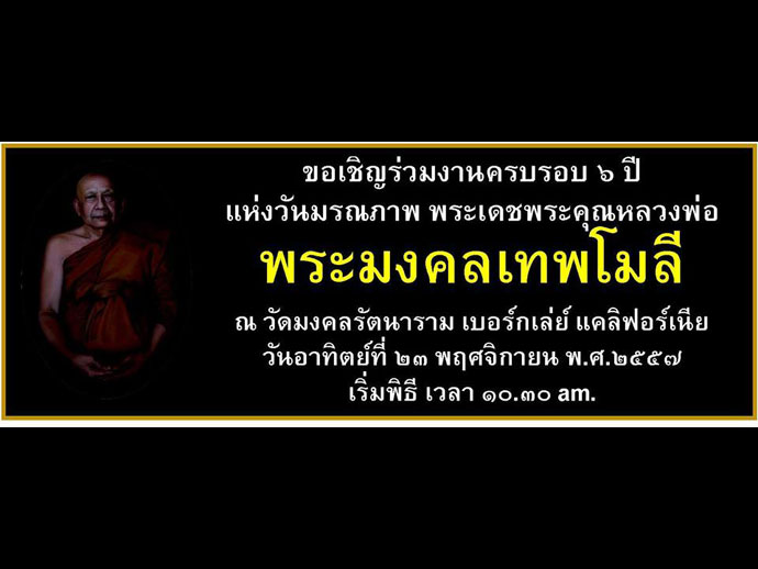 นิมิตตัง สาธุ รูปานัง กตัญญู กตเวทิตา ความกตัญญูเป็นเครื่องหมายของคนดีฯ ขอเรียนเชิญศิษยานุศิษย์ และสาธุชนทั่วไปในเบย์แอเรีย ร่วมทำบุญเนื่องในโอกาสวันครบรอบวันมรณภาพของ พระเดชพระคุณหลวงพ่อพระมงคลเทพโมลี อดีตเจ้าอาวาสวัดมงคลรัตนาราม เบิร์กเล่ย์ อาทิตย์ที่ 23 พฤศจิกายน ณ วัดมงคลรัตนาราม เริ่มเวลา 10:00 AM พระสงฆ์ 10 รูปเจริญพระพุทธมนต์ ทอดผ้าบังสุกุล และถวายภัตตาหารเพลตามลำดับ อย่าลืมนะครับ ใครมีอาหารหวานคาวก็มาร่วมทำบุญกันเป็นการรำลึกถึงและแสดงออกซึ่งความกตัญญูกตเวที