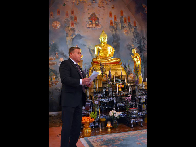 โดยพิธีดังกล่าวได้จัดในเวลา ๑๙.๐๐ น. วันพุธที่ ๑ เมษายน ๒๕๕๘ ณ อุโบสถวัดพุทธานุสรณ์ โดยคณะกรรมการจัดงานเลือกจัดในวันที่ ๑ เมษายน เวลากลางคืน เพื่อที่จะได้ตรงกับวันที่ ๒ เมษายน ในประเทศไทย