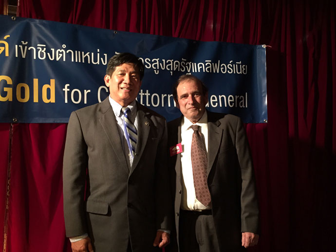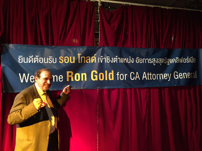 นายรอน โกลด์ ผู้สมัครเลือกตั้งตำแหน่งอัยการสูงสุดรัฐแคลิฟอร์เนียจากพรรครีพับลิกัน (Republican Candidate for CA Attorney General) เมื่อค่ำวันที่ 22 ที่ผ่านมาได้แวะมาที่ร้านอาหารไทยแลนด์พลาซ่าเพื่อแนะนำตัวเองกับสื่อมวลชนไทย นายโกลด์เป็นทนายความมากว่า 40 ปีและมั่นใจที่จะสามารถนำประสบการณ์ด้านกฎหมายมาช่วยชาวแคลิฟอร์เนียได้ โดยเฉพาะอย่างยิ่งการพัฒนาการศึกษา การปกป้องและดูแลผู้สูงอายุ และการช่วยธุรกิจขนาดเล็กในการขยายกิจการโดยสนับสนุนที่จะปรับปรุงและลดหย่อนกฎระเบียบต่างๆและภาษีจดทะเบียนเป็นต้น สิ่งที่นายโกลด์หวังที่จะทำถ้าได้รับเลือกตั้งเป็นอัยการสูงสุดคือสนับสนุนกฎหมายในการจำหน่ายและครอบครองกัญชาและจัดเก็บภาษีของการจำหน่ายกัญชา สร้างรายได้ให้กับรัฐอย่างเป็นระบบและเป็นการกำจัดอาชญากรพ่อค้าเถื่อนนอกระบบไปในตัว เขาจะสนับสนุนให้มีโทษประหารชีวิตสำหรับผู้ถูกตัดสินในคดีฆาตกรรมตำรวจและคดีฆ่าข่มขืนและจะเร่งขบวนการอุทธรณ์ในคดีที่ผู้ต้องหาได้ถูกตัดสินประหารชีวิต ให้สั้นลงเหลือเพียง 3-5 ปี จากขบวนการอุทธรณ์ปัจจุบันที่อยู่ระหว่าง 17-25 ปี