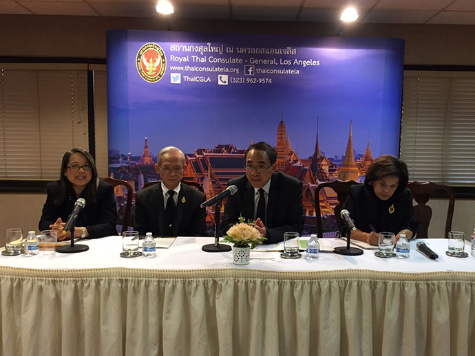 ณ นครลอสแอนเจลิส โดยมี นางชัญชนิฐ มาร์เทอเรล ผู้อำนวยการศูนย์ส่งเสริมชาวไทย นางกิริยา หิรัญพลกุล ประธานสภาสตรีไทยแห่งแคลิฟอร์เนียใต้ นายประชา แซ่หว่อง ผู้แทนวัดป่าธรรมชาติ นายสมชาย ไทยทัน ผู้แทนวัดไทยลอสแอนเจลิส และนายสุรสีห์ จิตตมานนท์กุล ผู้สื่อข่าวสถานีโทรทัศน์แนททีวี เป็นผู้ร่วมแถลงข่าวการจัดกิจกรรมเทอดพระเกียรติและถวายความอาลัย